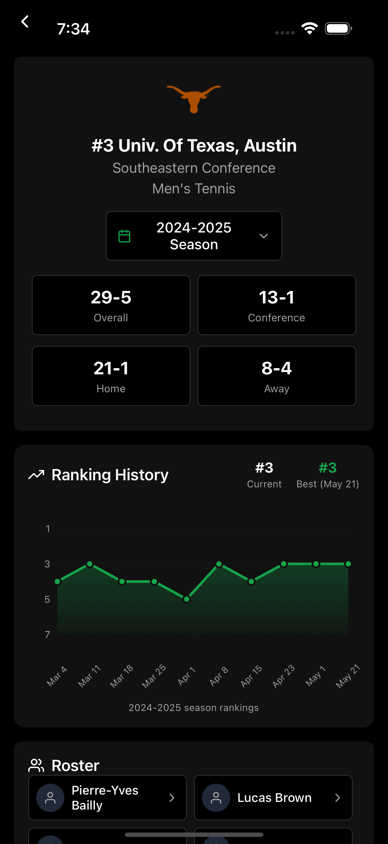 React Native mobile app for college tennis analytics that tracks D1 tennis programs, players, tournaments, match results, and rankings with features like team/player favorites, tournament draws and team/player form. The backend uses FastAPI with SQLAlchemy and PostgreSQL hosted on DigitalOcean, delivering a polished user experience that effectively navigates the fragmented college tennis data ecosystem.
