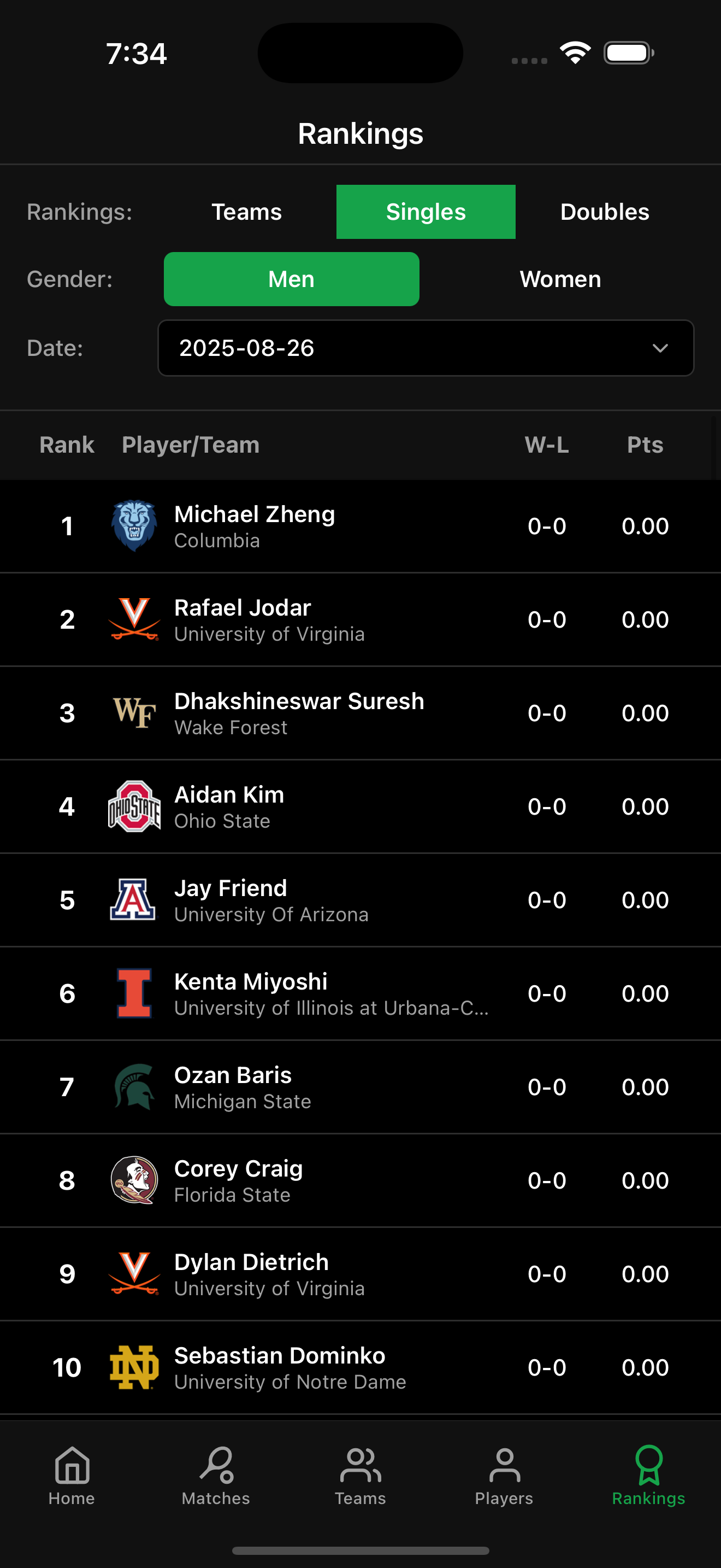 React Native mobile app for college tennis analytics that tracks D1 tennis programs, players, tournaments, match results, and rankings with features like team/player favorites, tournament draws and team/player form. The backend uses FastAPI with SQLAlchemy and PostgreSQL hosted on DigitalOcean, delivering a polished user experience that effectively navigates the fragmented college tennis data ecosystem.
